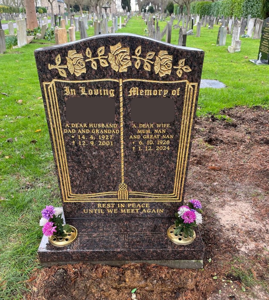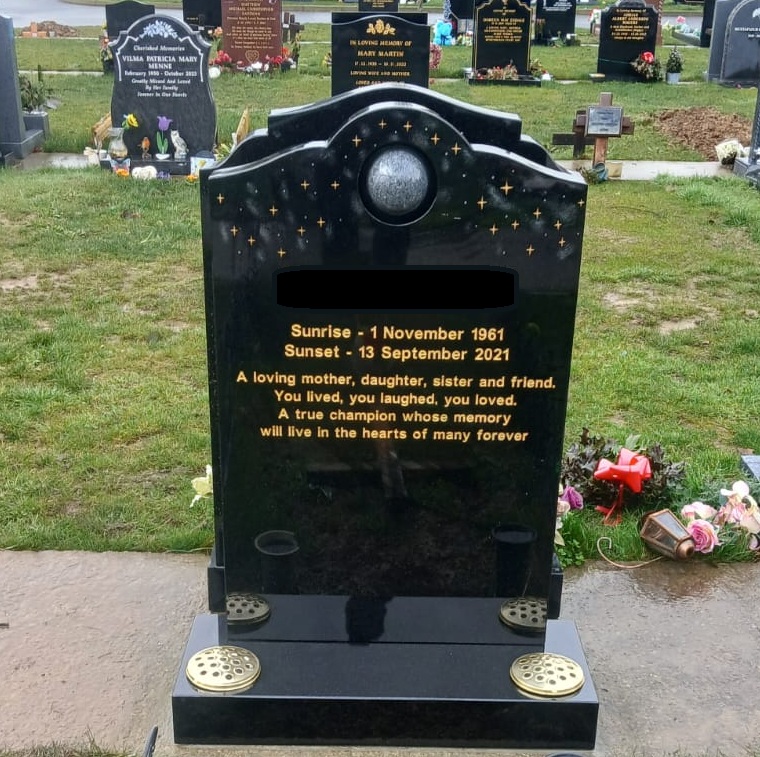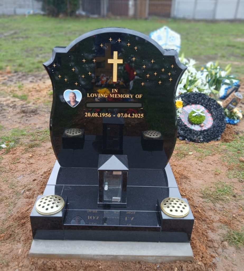 Memorials are available in a variety of coloured granites and finishes, with options for hand-crafted or computer-cut lettering, decorative carving, and etched portraits.